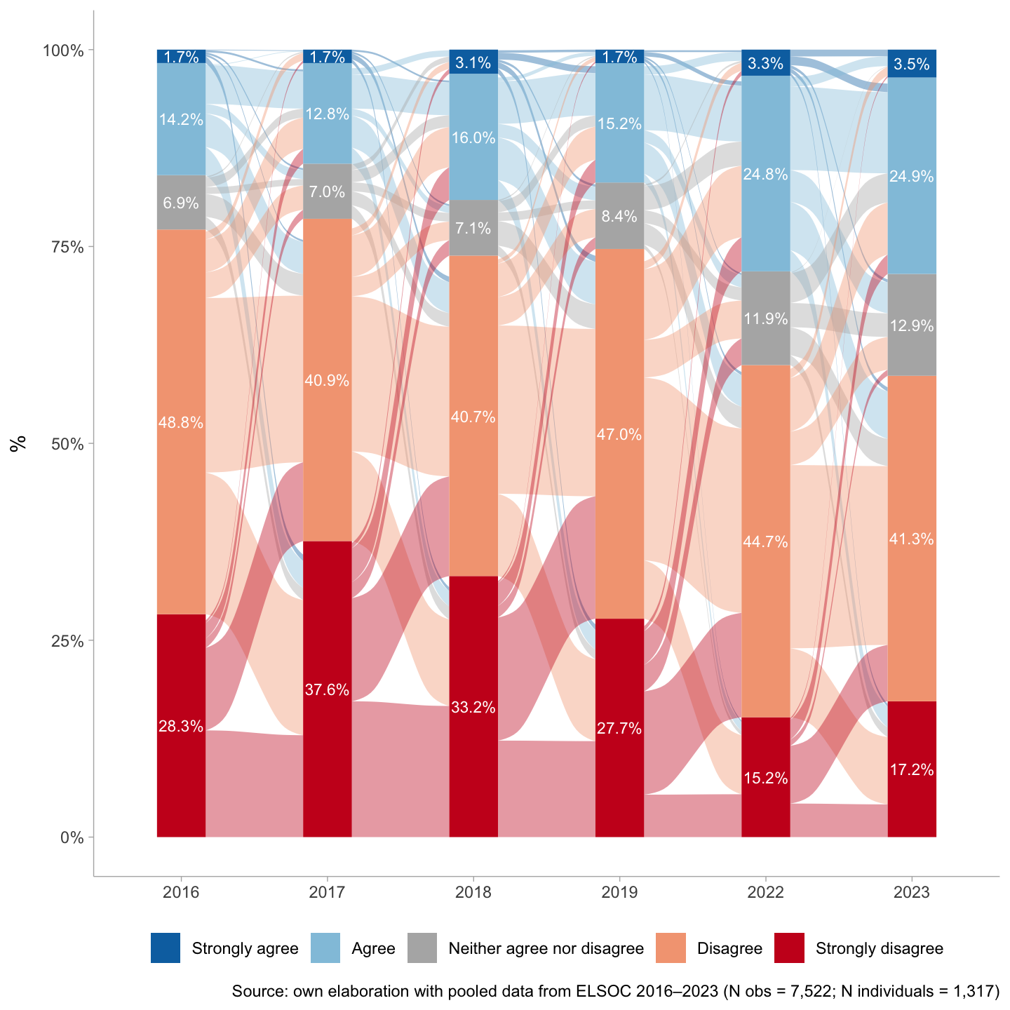 ELSOC has been administered annually since 2016, except in 2020 when fieldwork was suspended due to the COVID-19 pandemic. For this study, we use waves 2016, 2017, 2018, 2019, 2022, and 2023. The 2021 wave is excluded because the questionnaire version omitted key variables for the analysis. By wave 6, cumulative panel attrition was approximately 40%; we therefore restrict the analysis to a balanced panel, yielding a two-level data set of N = 5,755 observations nested within N = 1,027 individuals. Additional documentation on sampling, attrition, and weighting is available from the ELSOC study team, and the data are publicly accessible through the ELSOC Dataverse.