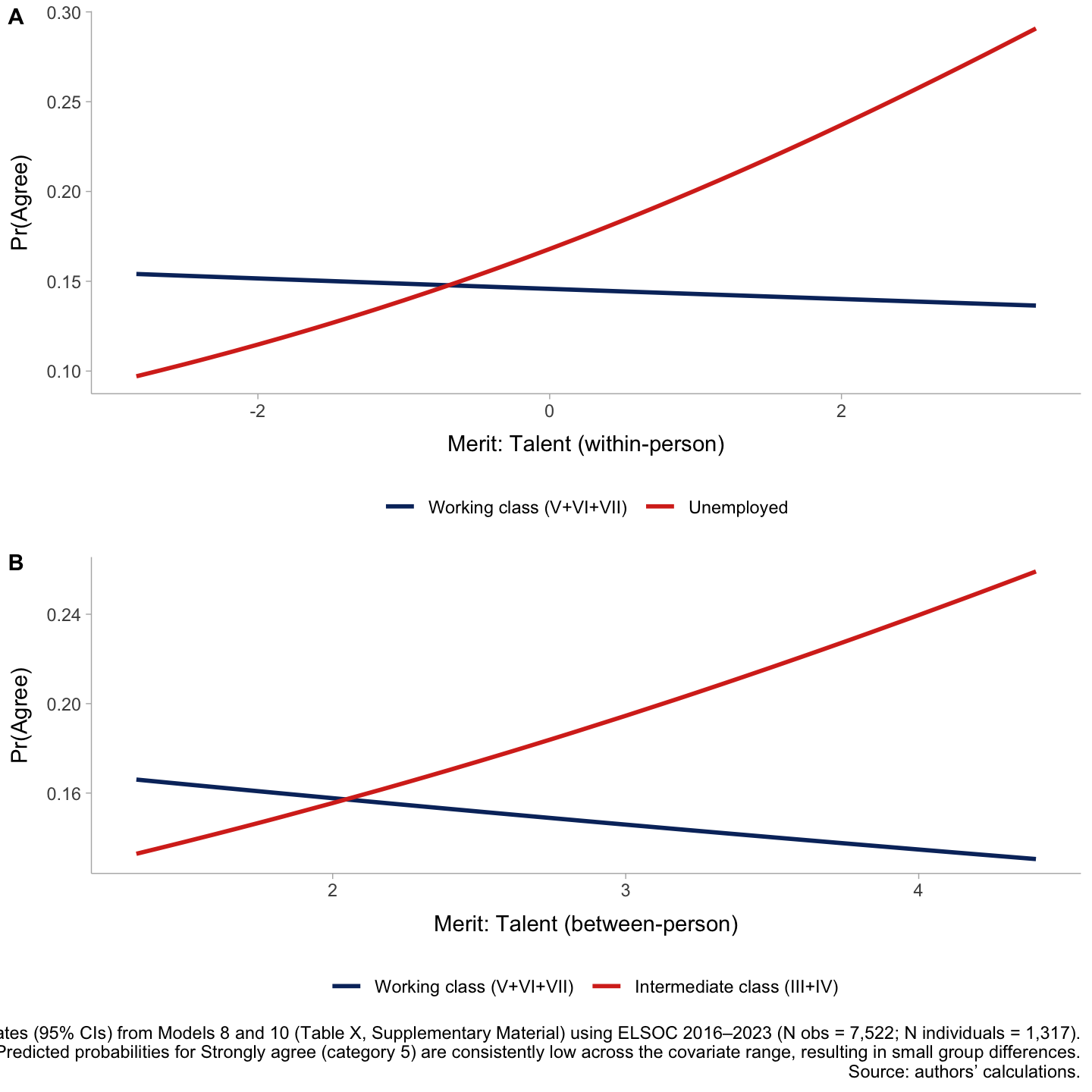 Two interaction effects nevertheless stand out and are illustrated in Figure 4. First, panel A shows that the within-person association between talent-based meritocratic perceptions and pension market justice differs by labour-market status. Within-person deviations in perceived talent rewards are unrelated to pension market justice in the reference group (\beta = −0.024, p = .67), but become significantly more positive among unemployed respondents (interaction \beta = 0.257, p = .049), implying a net within-person effect of \beta = 0.233 (OR ≈ 1.26). Second, panel B indicates that the between-person association between average (person-mean) talent-based meritocratic perceptions and pension market justice varies by social class: it is null in the working class (\beta = −0.089, p = .50) but significantly stronger in the intermediate class (interaction \beta = 0.401, p = .035), yielding a positive between-person slope of \beta = 0.313 (OR ≈ 1.37). Taken together, these models indicate a largely homogeneous association between meritocratic beliefs and pension market justice, with limited evidence of moderation. Where moderation emerges, it is concentrated in the talent dimension and confined to specific middle-class and non-class positions rather than reflecting systematic stratification across the whole class structure.