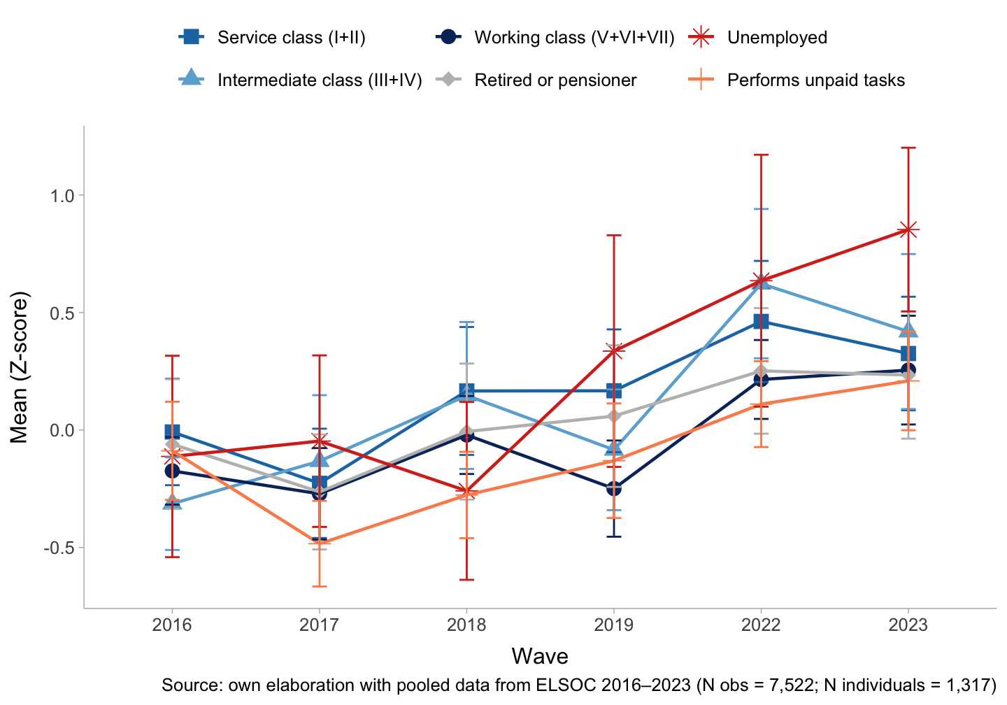 Turning to social class differences, Figure 3 plots longitudinal trajectories of pension market justice by class from 2016 to 2023. The figure shows a broadly upward trend across all classes, especially after 2019, alongside increasingly similar levels over time. The unemployed group shows the most significant change, moving from strong rejection (approximately −0.6 in 2016) to moderate acceptance (approximately 0.7 in 2023). Retirees/pensioners also increase steadily, from near zero in 2016 to roughly 0.5 by 2023, and the service class rises notably—particularly between 2019 and 2022—reaching values close to 0.5. The working class follows a similar trajectory, though at slightly lower levels. Overall, the trajectories suggest convergence toward greater acceptance of pension inequality during 2019–2023, a period marked by social unrest, the pandemic, and pension fund withdrawals (10% retiros), raising questions about how these disruptions and the surrounding policy debate reshaped views of distributive justice.