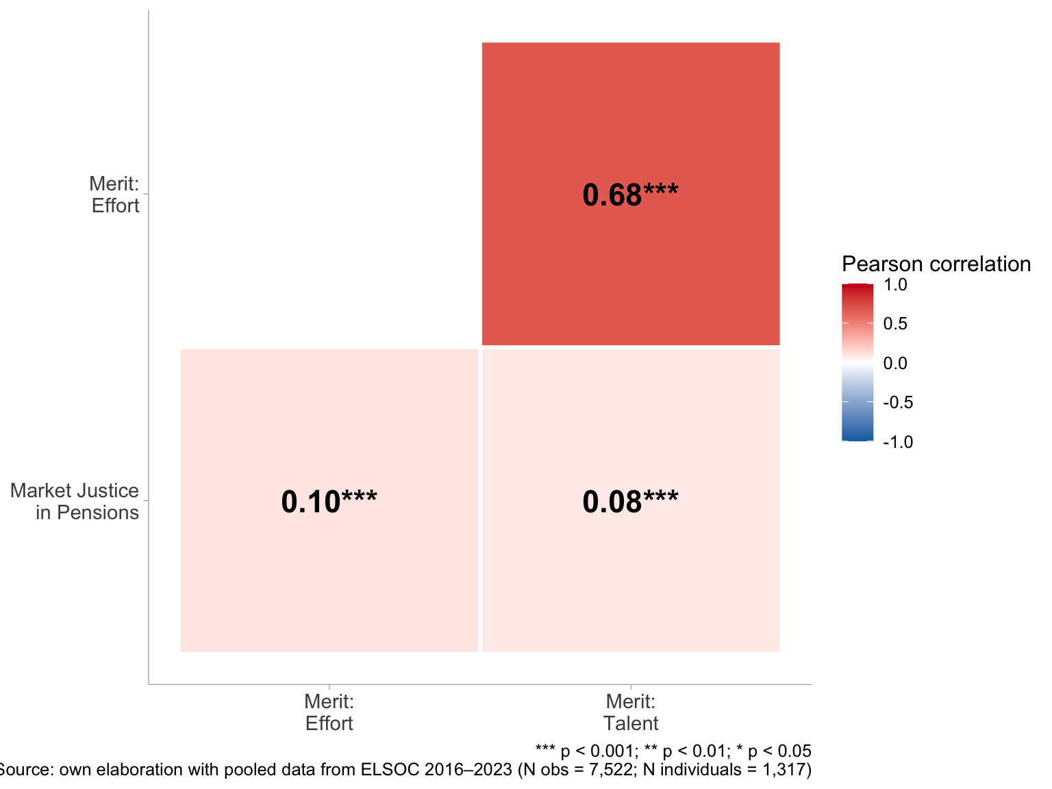 Figure 2 shows the correlation matrix between meritocratic perceptions and preferences for pension market justice. Both effort-based (r = 0.10, p < 0.001) and talent-based (r = 0.08, p < 0.001) meritocratic perceptions are positively associated with greater support for market-based pension welfare. Although these correlations are modest, their statistical significance indicates a consistent bivariate relationship. The two meritocracy indicators are also strongly correlated (r = 0.68, p < 0.001), suggesting they capture a shared meritocratic worldview while remaining sufficiently distinct to justify treating them as separate constructs. Taken together, these patterns provide initial support for the expectation that meritocratic perceptions are associated with greater acceptance of income-linked pension outcomes, while also suggesting that other factors likely account for most of the variation in these preferences.