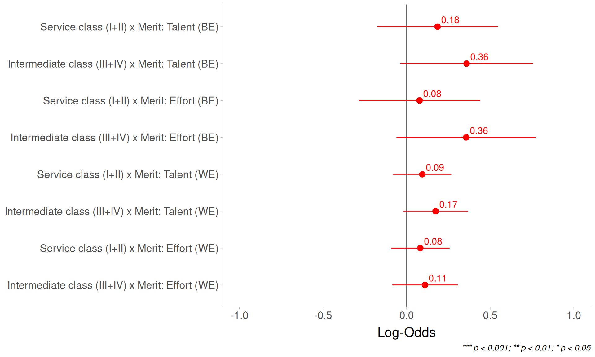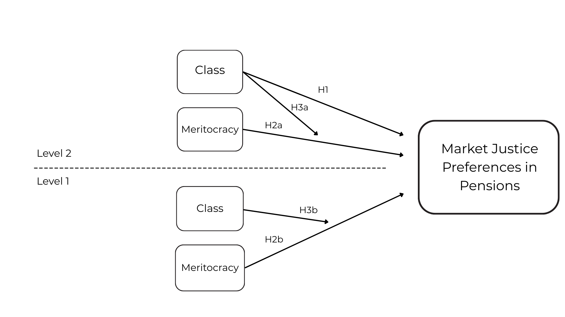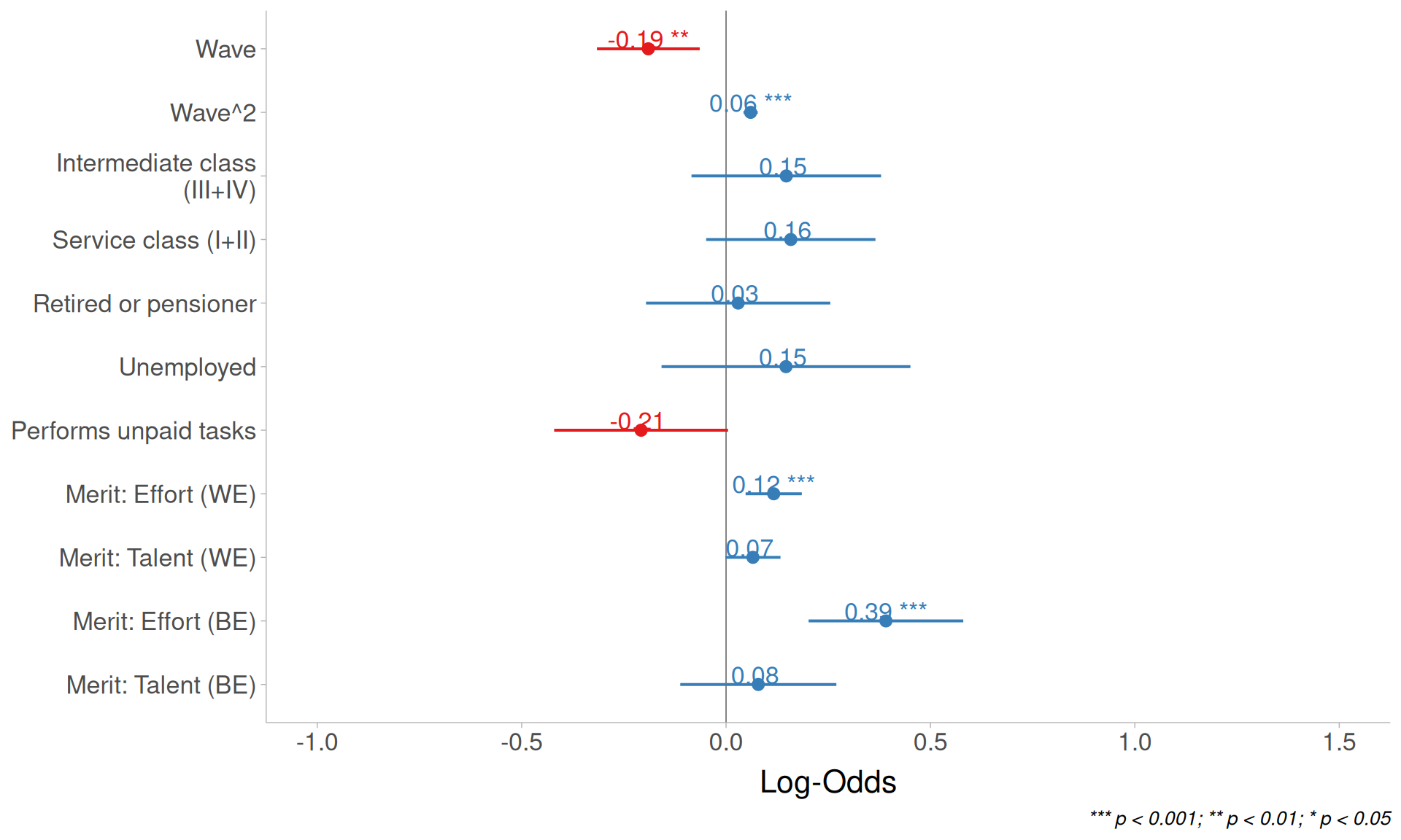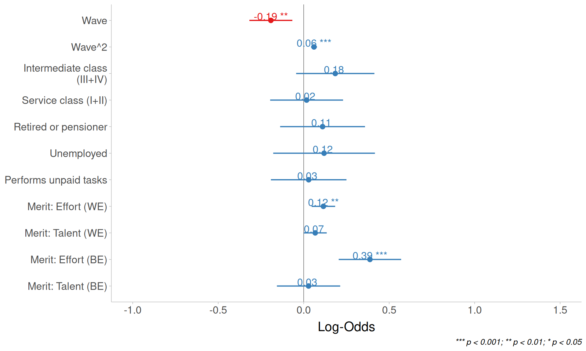 \(H3_{b} \; (\text{Within-person}):\) cuando personas de clase alta incrementan sus percepciones meritocráticas a lo largo del tiempo (WE), su preferencia por justicia de mercado en pensiones aumenta más que en clases bajas