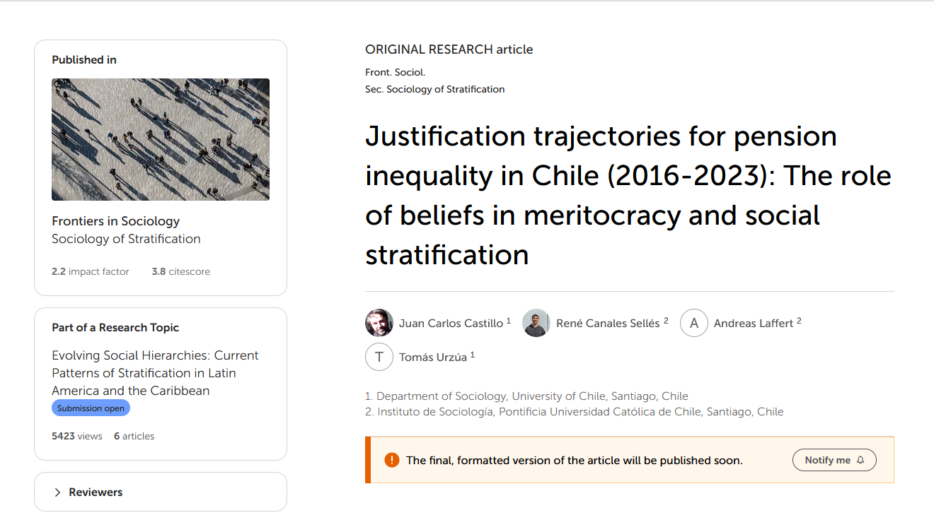 Forthcomming: Castillo JC, Canales Sellés R, Laffert A and Urzúa T (2026) “Justification trajectories for pension inequality in Chile (2016–2023): The role of social class and beliefs in meritocracy”. Front. Sociol. 11:1771856.doi